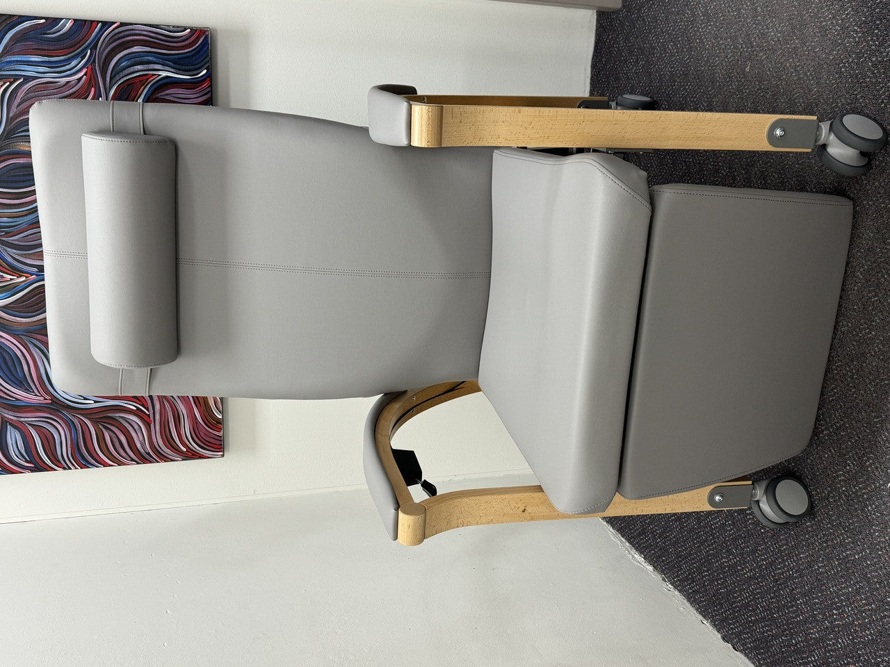 The combination of easy care surfaces and solid beech wood creates a pleasant room atmosphere. The backrest and the legrest of all chairs are continuously and synchronously adjustable by about 50° to a rest position either electrically or manually supported by a gas spring.